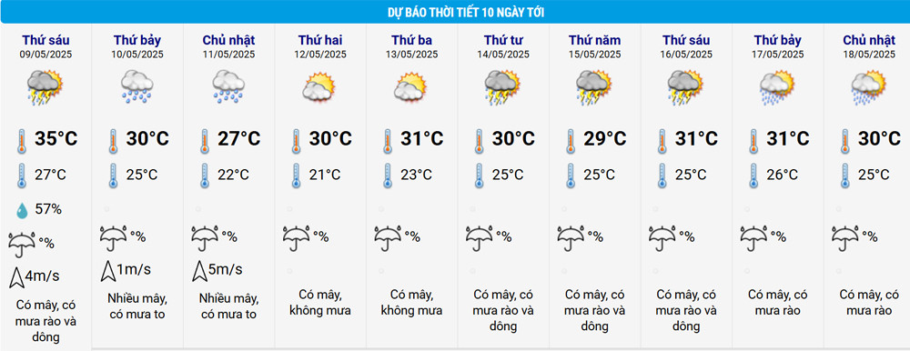 Dự báo, trước khi không khí lạnh yếu tràn về gây mưa giông, trong ngày mai (9/5), ở phía Tây Bắc Bộ và khu vực từ Thanh Hóa đến Phú Yên tiếp tục có nắng nóng và nắng nóng gay gắt, có nơi đặc biệt gay gắt với nhiệt độ cao nhất 36-38 độ, có nơi trên 39 độ; độ ẩm tương đối thấp nhất 45-50%.