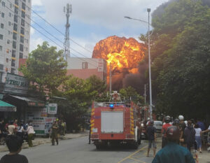 Chỉ trong ít phút, lửa bốc lên cuồn cuộn kèm khói đen nghi ngút, nhiều tiếng nổ lớn cũng phát ra từ khu vực cháy. Tại trung tâm khu vực hỏa hoạn, liên tiếp xuất hiện “quả cầu lửa” bốc lên cao khiến người dân quanh khu vực hốt hoảng. Các công nhân làm việc bên trong và lân cận nhà xưởng phải sơ tán đến nơi an toàn.