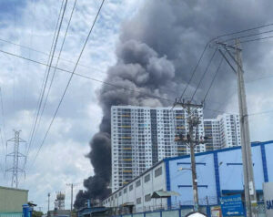 Ngọn lửa cuồn cuộn kèm theo nhiều tiếng nổ lớn từ nhà xưởng rộng hàng ngàn mét vuông ở TPHCM, lực lượng chức năng đang tiếp cận khống chế hỏa hoạn.